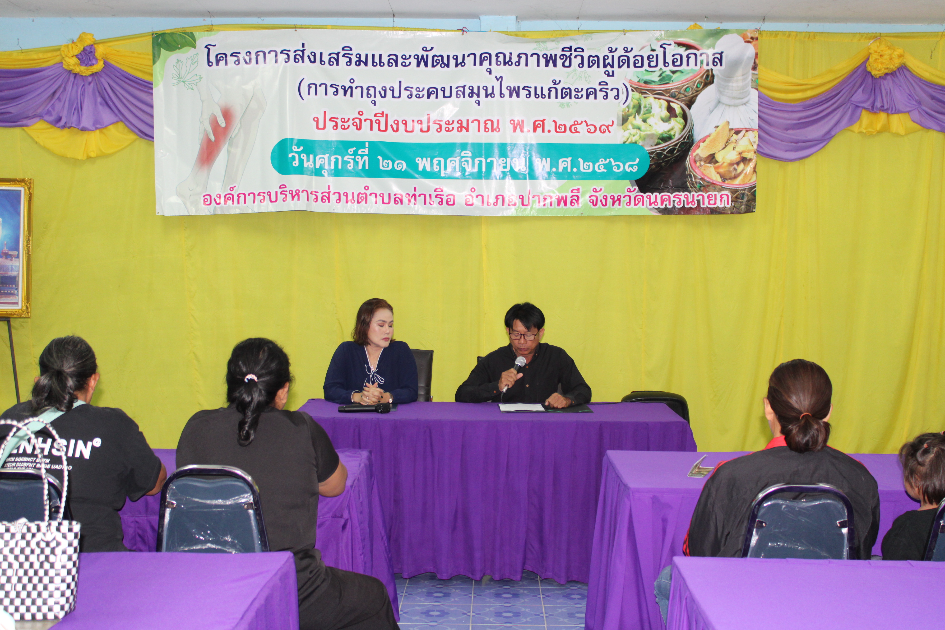 วันศุกร์ที่ 21 พฤศจิกายน 2568 องค์การบริหารส่วนตำบลท่าเรือได้จัดโครงการส่งเสริมและพัฒนาคุณภาพชีวิตผู้ด้วยโอกาส (การทำถุงประคบสมุนไพรแก้ตะคริว) ประจำปีงบประมาณ พ.ศ.2569 ณ องค์การบริหารส่วนตำบลท่าเรือ อำเภอปากพลี จังหวัดนครนายก